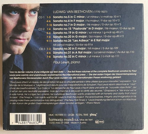 3 CDs / Paul Lewis, piano / Beethoven / Harmonia Mundi / Edição importada Austria – 2008 / CD tocando normalmente. A Oto Livraria é uma extensão da Oto Reifschneider Galeria de Arte, que funciona em Brasília desde 2015. Com foco em artes e assuntos correlatos (como design, ilustração, fotografia e histórias em quadrinhos), o acervo também conta com LPs, CDs e DVDs. A Oto Livraria funciona na mesma quadra da galeria de arte. As compras podem ser retiradas pessoalmente em Brasília ou enviadas pelos Correios (solicite valores de envio).