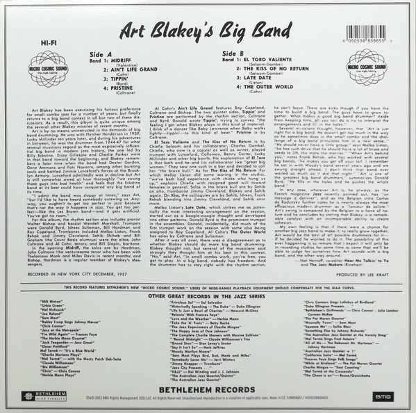Lançado em 1957, o disco Art Blakey Big Band é um registro singular na carreira do icônico baterista, que aqui expande a formação de seu famoso Jazz Messengers para o formato de orquestra. O álbum apresenta arranjos sofisticados de nomes como Melba Liston e Al Cohn, explorando uma sonoridade mais robusta e orquestral sem perder a intensidade e o swing característicos do hard bop. Acompanhado por músicos de elite, Blakey mantém o vigor rítmico que se tornou sua marca registrada, provando que sua energia contagiante funcionava perfeitamente mesmo em um conjunto maior. É uma obra essencial para compreender a versatilidade de um dos maiores líderes de banda da história do jazz.