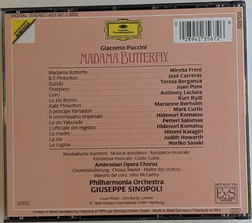 Box set / 3 CDs / Madama Butterfly / Giacomo Puccini – Mirella Freni – José Carreras – Teresa Berganza – Juan Pons / Giacomo Puccini / Deutsche Grammophon.A Oto Livraria é uma extensão da Oto Reifschneider Galeria de Arte, que funciona em Brasília desde 2015. Com foco em artes e assuntos correlatos (como design, ilustração, fotografia e histórias em quadrinhos), o acervo também conta com LPs, CDs e DVDs. A Oto Livraria funciona na mesma quadra da galeria de arte. As compras podem ser retiradas pessoalmente em Brasília ou enviadas pelos Correios (solicite valores de envio).