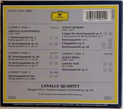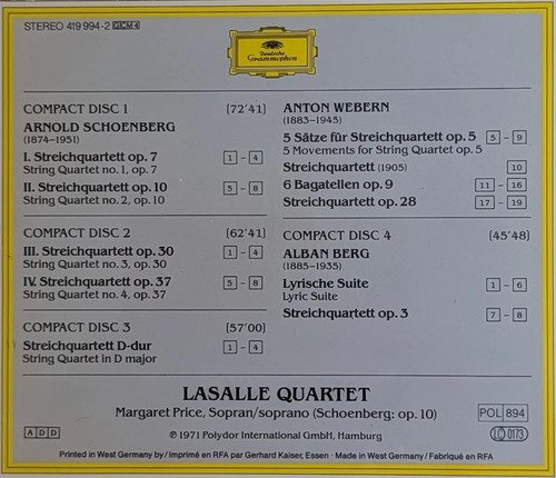 Box set / 4 CDs / Neue Wiener Schule – Second Viennese School / Schoenberg – Berg – Webern – Lasalle Quartet / Deutsche Grammophon.A Oto Livraria é uma extensão da Oto Reifschneider Galeria de Arte, que funciona em Brasília desde 2015. Com foco em artes e assuntos correlatos (como design, ilustração, fotografia e histórias em quadrinhos), o acervo também conta com LPs, CDs e DVDs. A Oto Livraria funciona na mesma quadra da galeria de arte. As compras podem ser retiradas pessoalmente em Brasília ou enviadas pelos Correios (solicite valores de envio).