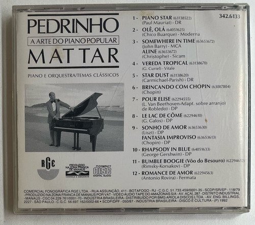 Pedrinho Mattar / A Arte do Piano Popular / Piano e Orquestra / Temas Clássicos / Edição Nacional Brasil – 1992 / CD tocando normalmente.A Oto Livraria é uma extensão da Oto Reifschneider Galeria de Arte, que funciona em Brasília desde 2015. Com foco em artes e assuntos correlatos (como design, ilustração, fotografia e histórias em quadrinhos), o acervo também conta com LPs, CDs e DVDs. A Oto Livraria funciona na mesma quadra da galeria de arte. As compras podem ser retiradas pessoalmente em Brasília ou enviadas pelos Correios (solicite valores de envio).