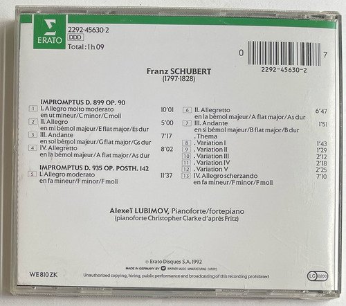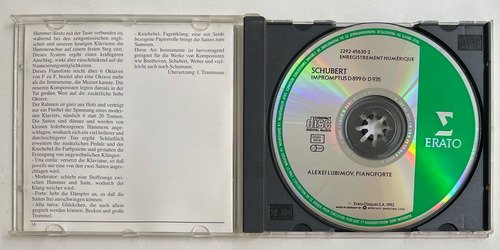 Alexeï Lubimov, Pianoforte / Franz Schubert / Impromptus D. 899 OP. 90 & D. 935 OP. POSTH. 142 / Erato / Edição importada Alemanha – 1992 / CD tocando normalmente. A Oto Livraria é uma extensão da Oto Reifschneider Galeria de Arte, que funciona em Brasília desde 2015. Com foco em artes e assuntos correlatos (como design, ilustração, fotografia e histórias em quadrinhos), o acervo também conta com LPs, CDs e DVDs. A Oto Livraria funciona na mesma quadra da galeria de arte. As compras podem ser retiradas pessoalmente em Brasília ou enviadas pelos Correios (solicite valores de envio).