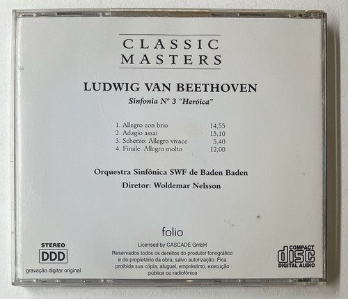 Orquestra Sinfônica SWF de Baden-Baden Diretor: Woldemar Nelsson / Beethoven – Sinfonia N°3 “Heróica” / Folio / Classic Masters / CD tocando normalmente.A Oto Livraria é uma extensão da Oto Reifschneider Galeria de Arte, que funciona em Brasília desde 2015. Com foco em artes e assuntos correlatos (como design, ilustração, fotografia e histórias em quadrinhos), o acervo também conta com LPs, CDs e DVDs. A Oto Livraria funciona na mesma quadra da galeria de arte. As compras podem ser retiradas pessoalmente em Brasília ou enviadas pelos Correios (solicite valores de envio).