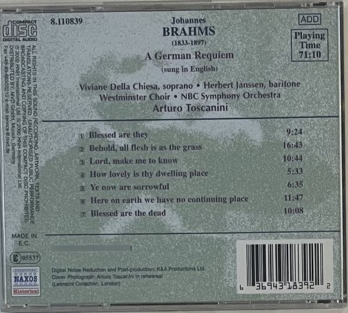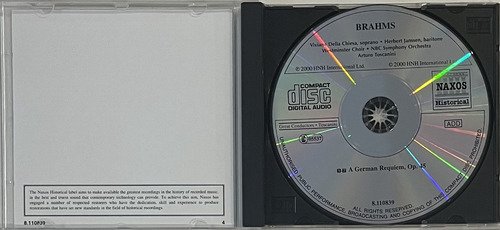 CD Naxos / Brahms / A German Requiem /Great Conductors • Toscanini / Viviane Della Chiesa, soprano / Herbert Janssen, baritone / Westminster Choir / NBC Symphony Orchestra / Arturo Toscanini.A Oto Livraria é uma extensão da Oto Reifschneider Galeria de Arte, que funciona em Brasília desde 2015. Com foco em artes e assuntos correlatos (como design, ilustração, fotografia e histórias em quadrinhos), o acervo também conta com LPs, CDs e DVDs. A Oto Livraria funciona na mesma quadra da galeria de arte. As compras podem ser retiradas pessoalmente em Brasília ou enviadas pelos Correios (solicite valores de envio).