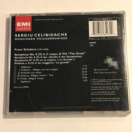 Celibidache / Münchner Philharmoniker – Schubert / 1997, EMI / Edição importada / EMI Classics / CD tocando normalmente / Música clássica / Música de concerto / Música erudita.
