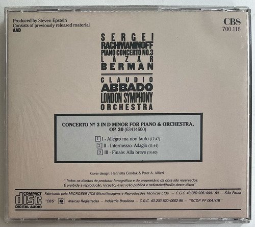 Claudio Abbado – Lodndon Symphony Orchestra / Rachmaninoff – piano concerto No. 3 Lazar Berman / CBS / Edição Nacional Brasil / CD tocando normalmente. A Oto Livraria é uma extensão da Oto Reifschneider Galeria de Arte, que funciona em Brasília desde 2015. Com foco em artes e assuntos correlatos (como design, ilustração, fotografia e histórias em quadrinhos), o acervo também conta com LPs, CDs e DVDs. A Oto Livraria funciona na mesma quadra da galeria de arte. As compras podem ser retiradas pessoalmente em Brasília ou enviadas pelos Correios (solicite valores de envio).