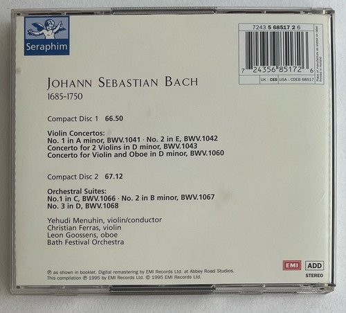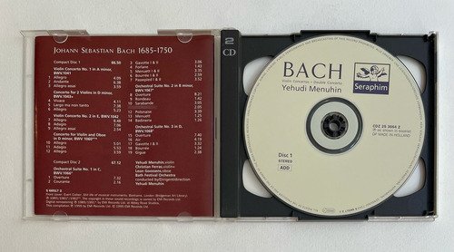 CD duplo / Yehudi Menuhin, violin / Christian Ferras, violin / Leon Goossens, oboe / Bath Festival Orchestra / Johann Sebastian Bach / Seraphim / Edição importada Holanda – 1995 / CD tocando normalmente. A Oto Livraria é uma extensão da Oto Reifschneider Galeria de Arte, que funciona em Brasília desde 2015. Com foco em artes e assuntos correlatos (como design, ilustração, fotografia e histórias em quadrinhos), o acervo também conta com LPs, CDs e DVDs. A Oto Livraria funciona na mesma quadra da galeria de arte. As compras podem ser retiradas pessoalmente em Brasília ou enviadas pelos Correios (solicite valores de envio).
