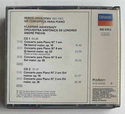 CD duplo / Vladimir Ashkenazy – Orquestra Sinfônica de Londres -André Previn / Sergei Prokofiev Os Concertos para Piano / London / Edição Nacional Brasil – 1989 / CD tocando normalmente. A Oto Livraria é uma extensão da Oto Reifschneider Galeria de Arte, que funciona em Brasília desde 2015. Com foco em artes e assuntos correlatos (como design, ilustração, fotografia e histórias em quadrinhos), o acervo também conta com LPs, CDs e DVDs. A Oto Livraria funciona na mesma quadra da galeria de arte. As compras podem ser retiradas pessoalmente em Brasília ou enviadas pelos Correios (solicite valores de envio).