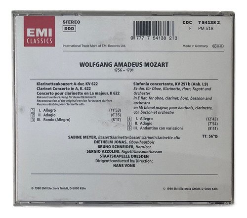 CD EMI Classics / Clarinet Concerto – Sinfonia Concertante K. 297b / Sabine Meyer – Diethelm Jonas – Sergio Azzouni – Bruno Schneider – Staatspelle Dresden – Hans Vonk.A Oto Livraria É Uma Extensão Da Oto Reifschneider Galeria De Arte, Que Funciona Em Brasília Desde 2015. Com Foco Em Artes E Assuntos Correlatos (como Design, Ilustração, Fotografia E Histórias Em Quadrinhos), O Acervo Também Conta Com Lps, Cds E Dvds. a Oto Livraria Funciona Na Mesma Quadra Da Galeria De Arte. as Compras Podem Ser Retiradas Pessoalmente Em Brasília Ou Enviadas Pelos Correios (solicite Valores De Envio).