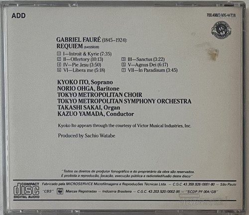 CD CBS / Fauré: Requiem / Kyoko Ito, Soprano Norio Ohga, Baritone – Tokyo Metropolitan Choir – Tokyo Metropolitan Symphony Orchestra – Takashi Sakai, Organ – Kazuo Yamada, Conductor / CBS Records Masterworks.A Oto Livraria é uma extensão da Oto Reifschneider Galeria de Arte, que funciona em Brasília desde 2015. Com foco em artes e assuntos correlatos (como design, ilustração, fotografia e histórias em quadrinhos), o acervo também conta com LPs, CDs e DVDs. A Oto Livraria funciona na mesma quadra da galeria de arte. As compras podem ser retiradas pessoalmente em Brasília ou enviadas pelos Correios (solicite valores de envio).