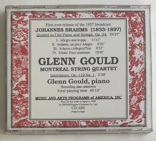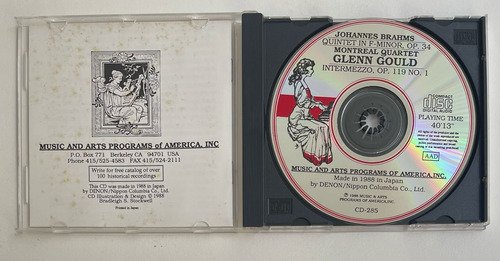 Glenn Gould, piano / Montreal String Quartet / Johannes Brahms / Quintet in F for Piano and Strings, Op. 34 / Intermezzo, Op. 119 No. 1 / Music and Arts Programs of America / Edição importada Japão – 1988 / CD tocando normalmente.A Oto Livraria é uma extensão da Oto Reifschneider Galeria de Arte, que funciona em Brasília desde 2015. Com foco em artes e assuntos correlatos (como design, ilustração, fotografia e histórias em quadrinhos), o acervo também conta com LPs, CDs e DVDs. A Oto Livraria funciona na mesma quadra da galeria de arte. As compras podem ser retiradas pessoalmente em Brasília ou enviadas pelos Correios (solicite valores de envio).