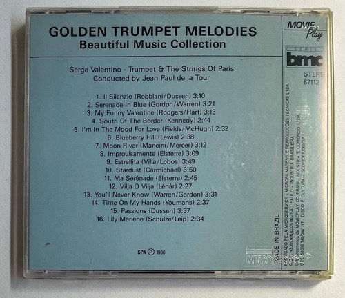 Golden Trumpet Melodies Beatiful Music Collection / Serge Valentino – Jean Paul de la Tour – Strings Of Paris / Movie Play / Edição Nacional Brasil – 1988 / CD tocando normalmente. A Oto Livraria é uma extensão da Oto Reifschneider Galeria de Arte, que funciona em Brasília desde 2015. Com foco em artes e assuntos correlatos (como design, ilustração, fotografia e histórias em quadrinhos), o acervo também conta com LPs, CDs e DVDs. A Oto Livraria funciona na mesma quadra da galeria de arte. As compras podem ser retiradas pessoalmente em Brasília ou enviadas pelos Correios (solicite valores de envio).