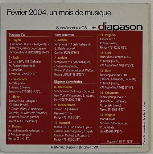 CD Diapason / Gustav Mahler – Symphonie No 4 (sehr Behaglich) / Les Meilleurs Extraits des Diapason d’or de février 2004 / Diapason D’or.A Oto Livraria é uma extensão da Oto Reifschneider Galeria de Arte, que funciona em Brasília desde 2015. Com foco em artes e assuntos correlatos (como design, ilustração, fotografia e histórias em quadrinhos), o acervo também conta com LPs, CDs e DVDs. A Oto Livraria funciona na mesma quadra da galeria de arte. As compras podem ser retiradas pessoalmente em Brasília ou enviadas pelos Correios (solicite valores de envio).