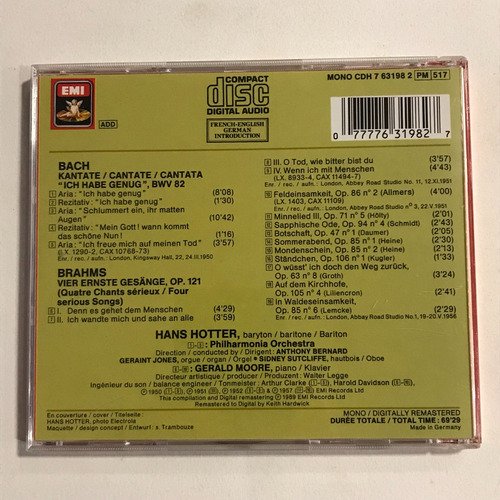 Hans Hotter – Bach: Kantate “Ich Habe Genug”, BWV 82/ Brahms: 4 erneste Gesänge & 10 Lieder/ 1989, EMI/ edição alemã/ coleção reférences/ CD tocando normalmente / Música clássica / Música de concerto / Música erudita.