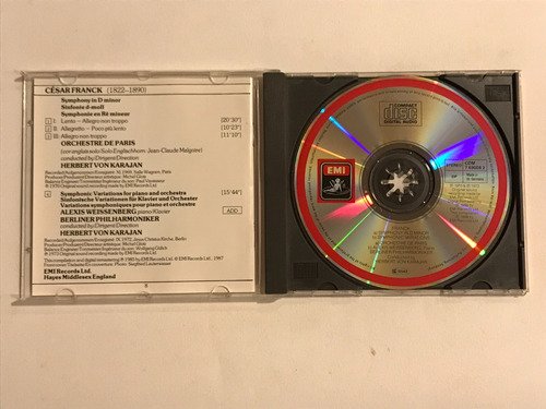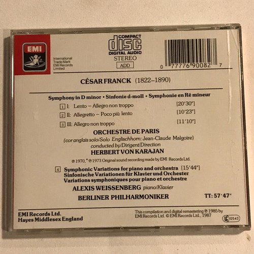 Herbert Von Karajan/ Alexis Weissenberg – Franck / Symphonie en Ré Mineur/ D minor/ D-moll/ Variations Symphoniques/ Orchestre de Paris/ Berliner Philharmoniker / 1987, EMI/ Edição Inglesa / CD tocando normalmente / Música clássica / Música de concerto / Música erudita.