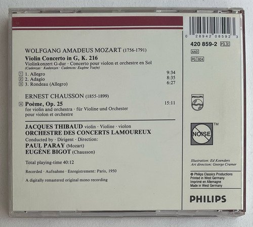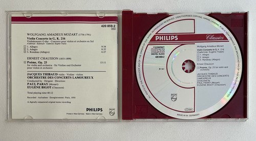Jaques Thibaud, violin – Orchestre des Concerts Lamoureux conducted by Paul Paray (Mozart), Eugène Bigot (Chausson) / Wolfgang Amadeus Mozart (1756-1791) Violin Concerto in G, K. 216 / Ernest Chausson (1855-1899) Poème, Op. 25 / Philips / Edição importada Alemanha – 1951 / CD tocando normalmente. A Oto Livraria é uma extensão da Oto Reifschneider Galeria de Arte, que funciona em Brasília desde 2015. Com foco em artes e assuntos correlatos (como design, ilustração, fotografia e histórias em quadrinhos), o acervo também conta com LPs, CDs e DVDs. A Oto Livraria funciona na mesma quadra da galeria de arte. As compras podem ser retiradas pessoalmente em Brasília ou enviadas pelos Correios (solicite valores de envio).