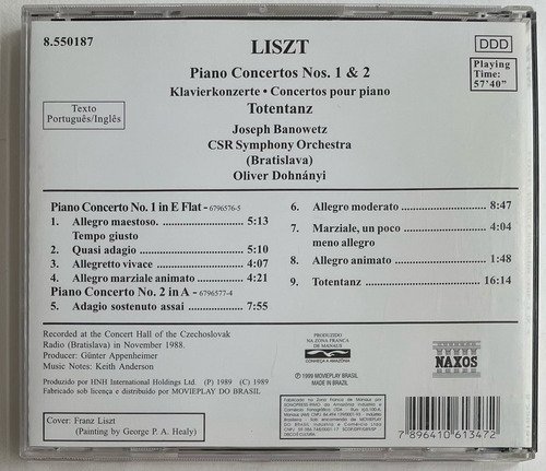 Joseph Banowetz, piano – CSR Symphony Orchestra – Oliver Dohnányi, regente / Liszt / Piano Concertos Nos. 1 & 2 – Totentanz / Naxos / Edição Nacional Brasil – 1989 / CD tocando normalmente. A Oto Livraria é uma extensão da Oto Reifschneider Galeria de Arte, que funciona em Brasília desde 2015. Com foco em artes e assuntos correlatos (como design, ilustração, fotografia e histórias em quadrinhos), o acervo também conta com LPs, CDs e DVDs. A Oto Livraria funciona na mesma quadra da galeria de arte. As compras podem ser retiradas pessoalmente em Brasília ou enviadas pelos Correios (solicite valores de envio).