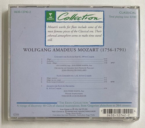 Lily Laskine, harp – Jean-Pierre Rampal, flute – Orchestre de Chambre Jean-François Paillard – Wiener Symphoniker – Theodor Guschlbauer / Mozart / Concerto for Flute & Harp K. 299 in C major – Flute Concerto No. 1, K. 313 in G major – Andante for Flute & Orchestra K. 315 in C major / Erato / Edição importada Alemanha – 1995 / CD tocando normalmente.A Oto Livraria é uma extensão da Oto Reifschneider Galeria de Arte, que funciona em Brasília desde 2015. Com foco em artes e assuntos correlatos (como design, ilustração, fotografia e histórias em quadrinhos), o acervo também conta com LPs, CDs e DVDs. A Oto Livraria funciona na mesma quadra da galeria de arte. As compras podem ser retiradas pessoalmente em Brasília ou enviadas pelos Correios (solicite valores de envio).