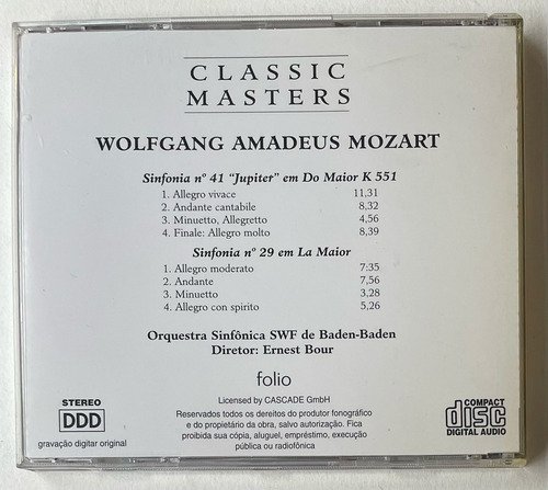 Orquestra Sinfônica SWF de Baden-Baden Direto: Ernest Bour / Mozart – Sinfonia N°41 “Jupiter” – Sinfonia N°9 em La Maior / Folio / Classic Masters / CD tocando normalmente. A Oto Livraria é uma extensão da Oto Reifschneider Galeria de Arte, que funciona em Brasília desde 2015. Com foco em artes e assuntos correlatos (como design, ilustração, fotografia e histórias em quadrinhos), o acervo também conta com LPs, CDs e DVDs. A Oto Livraria funciona na mesma quadra da galeria de arte. As compras podem ser retiradas pessoalmente em Brasília ou enviadas pelos Correios (solicite valores de envio).
