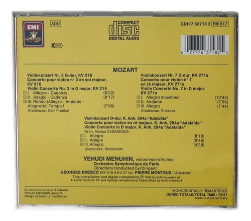 CD EMI / Références / Mozart – Violin Concertos – KV 216 • KV 271a • KV 294a “Adelaïde” / Yehudi Menuhin – Orchestre Symphonique de Paris – Georges Enesco – Pierre Monteux.A Oto Livraria é uma extensão da Oto Reifschneider Galeria de Arte, que funciona em Brasília desde 2015. Com foco em artes e assuntos correlatos (como design, ilustração, fotografia e histórias em quadrinhos), o acervo também conta com LPs, CDs e DVDs. A Oto Livraria funciona na mesma quadra da galeria de arte. As compras podem ser retiradas pessoalmente em Brasília ou enviadas pelos Correios (solicite valores de envio).