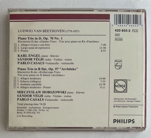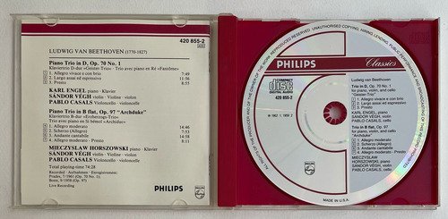 Karl Engel, piano – Sándor Végh, violin – Pablo Casals, Violoncello – Mieczyslaw Horszowski, piano / Ludwig Van Beethoven (1770-1827) / Piano Trio in D, Op. 70 No. 1 / Piano Trio in B flat, Op. 97 “Archduke” / Philips / Edição importada Estados Unidos – 1962 / CD tocando normalmente. A Oto Livraria é uma extensão da Oto Reifschneider Galeria de Arte, que funciona em Brasília desde 2015. Com foco em artes e assuntos correlatos (como design, ilustração, fotografia e histórias em quadrinhos), o acervo também conta com LPs, CDs e DVDs. A Oto Livraria funciona na mesma quadra da galeria de arte. As compras podem ser retiradas pessoalmente em Brasília ou enviadas pelos Correios (solicite valores de envio).