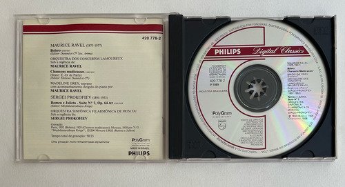 Maurice Ravel (1875-1937) – Bolero – Chansons Madécasses – Orquestra dos Concertos Lamoureux – Madeline Grey, soprano – com acompanhamento dirigido do piano por Maurice Ravel / Sergei Prokofiev (1891-1953) – Romeu e Julieta – Suíte N°. 2, Op. 64 -ter – Orquestra Sinfõnica Filarmônica de Moscou sob a regência de Sergei Prokofiev / Philips / Edição Nacional Brasil – 1989 / CD tocando normalmente. A Oto Livraria é uma extensão da Oto Reifschneider Galeria de Arte, que funciona em Brasília desde 2015. Com foco em artes e assuntos correlatos (como design, ilustração, fotografia e histórias em quadrinhos), o acervo também conta com LPs, CDs e DVDs. A Oto Livraria funciona na mesma quadra da galeria de arte. As compras podem ser retiradas pessoalmente em Brasília ou enviadas pelos Correios (solicite valores de envio).