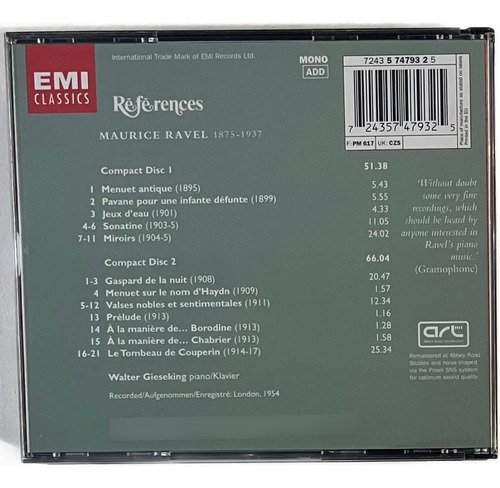 CD EMI Classics / Références / Ravel – The Complete Works for Solo Piano / Walter Gieseking / CD Duplo.A Oto Livraria É Uma Extensão Da Oto Reifschneider Galeria De Arte, Que Funciona Em Brasília Desde 2015. Com Foco Em Artes E Assuntos Correlatos (como Design, Ilustração, Fotografia E Histórias Em Quadrinhos), O Acervo Também Conta Com Lps, Cds E Dvds. a Oto Livraria Funciona Na Mesma Quadra Da Galeria De Arte. as Compras Podem Ser Retiradas Pessoalmente Em Brasília Ou Enviadas Pelos Correios (solicite Valores De Envio).