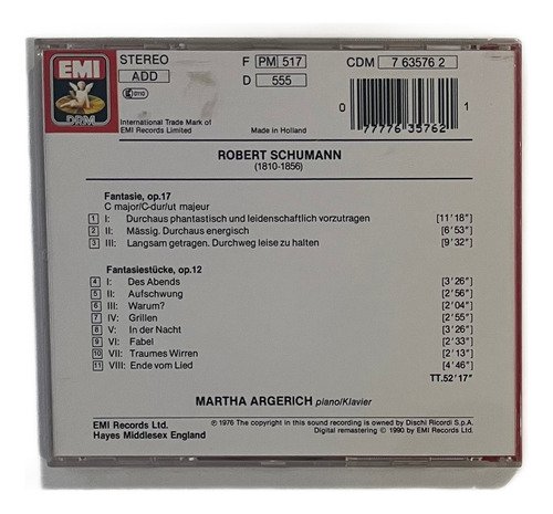 CD EMI DRM / Schumann – Fantasiestücke Op. 12 – Faritasie Op. 17 / Martha Argerich.A Oto Livraria é uma extensão da Oto Reifschneider Galeria de Arte, que funciona em Brasília desde 2015. Com foco em artes e assuntos correlatos (como design, ilustração, fotografia e histórias em quadrinhos), o acervo também conta com LPs, CDs e DVDs. A Oto Livraria funciona na mesma quadra da galeria de arte. As compras podem ser retiradas pessoalmente em Brasília ou enviadas pelos Correios (solicite valores de envio).