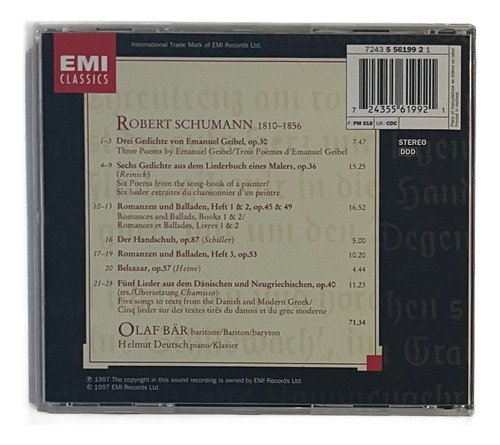 CD EMI Classics / Schumann Lieder, Romanzen & Balladen / Olaf Bär – Helmut Deutsch.A Oto Livraria é uma extensão da Oto Reifschneider Galeria de Arte, que funciona em Brasília desde 2015. Com foco em artes e assuntos correlatos (como design, ilustração, fotografia e histórias em quadrinhos), o acervo também conta com LPs, CDs e DVDs. A Oto Livraria funciona na mesma quadra da galeria de arte. As compras podem ser retiradas pessoalmente em Brasília ou enviadas pelos Correios (solicite valores de envio).