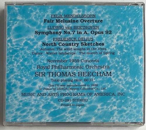 Royal Philharmonic Orchestra, Sir Thomas Beecham / November 1959 Concerts / Mendelssohn – Fair Melusine Overture / Beethoven – Symphony No. 7 in A, Opus 92 / Delius – North Country Sketches / Music and Arts Programs of America, INC / Edição importada Japão – 1988 / CD tocando normalmente. A Oto Livraria é uma extensão da Oto Reifschneider Galeria de Arte, que funciona em Brasília desde 2015. Com foco em artes e assuntos correlatos (como design, ilustração, fotografia e histórias em quadrinhos), o acervo também conta com LPs, CDs e DVDs. A Oto Livraria funciona na mesma quadra da galeria de arte. As compras podem ser retiradas pessoalmente em Brasília ou enviadas pelos Correios (solicite valores de envio).