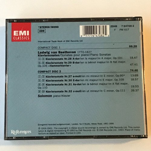 Solomon – Beethoven/ Klaviersonaten/Piano Sonatas/ Opp. 90, 101, 106, 109, 110 & 111/ 1993, EMI / Edição norte americana / Coleção Reférences, EMI Classics/ CD Duplo / CDs tocando normalmente / Música clássica / Música de concerto / Música erudita.