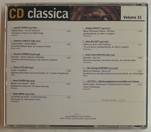 CD classica Volume 21 / CD Promotionnel encarté / Musique Sacrée 2000 / Classica Avril / Splendeurs oubliées de la musique sacrée / CD tocando normalmente.A Oto Livraria é uma extensão da Oto Reifschneider Galeria de Arte, que funciona em Brasília desde 2015. Com foco em artes e assuntos correlatos (como design, ilustração, fotografia e histórias em quadrinhos), o acervo também conta com LPs, CDs e DVDs. A Oto Livraria funciona na mesma quadra da galeria de arte. As compras podem ser retiradas pessoalmente em Brasília ou enviadas pelos Correios (solicite valores de envio).