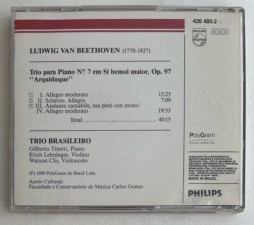 Trio Brasileiro: Gilberto Tinetti, piano – Erich Lehninger, violino – Watson Clis – Violoncelo / Ludwig Van Beethoven / Trio para Piano N°. 7 em Si bemol maior, Op. 97 “Arquiduque” / Philiphs / Edição Nacional Brasil – 1989 / CD tocando normalmente.A Oto Livraria é uma extensão da Oto Reifschneider Galeria de Arte, que funciona em Brasília desde 2015. Com foco em artes e assuntos correlatos (como design, ilustração, fotografia e histórias em quadrinhos), o acervo também conta com LPs, CDs e DVDs. A Oto Livraria funciona na mesma quadra da galeria de arte. As compras podem ser retiradas pessoalmente em Brasília ou enviadas pelos Correios (solicite valores de envio).