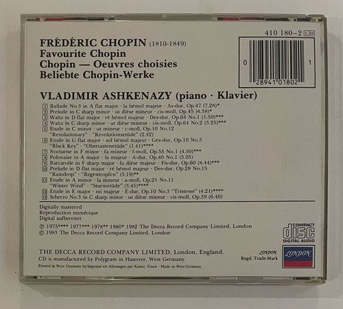 Vladimir Ashkenazy, piano / Favourite Chopin – Chopin Oeuvres choisies & Beliebte Chopin-Werke / London Records / Edição importada Alemanha – 1983 / CD tocando normalmente.A Oto Livraria é uma extensão da Oto Reifschneider Galeria de Arte, que funciona em Brasília desde 2015. Com foco em artes e assuntos correlatos (como design, ilustração, fotografia e histórias em quadrinhos), o acervo também conta com LPs, CDs e DVDs. A Oto Livraria funciona na mesma quadra da galeria de arte. As compras podem ser retiradas pessoalmente em Brasília ou enviadas pelos Correios (solicite valores de envio).