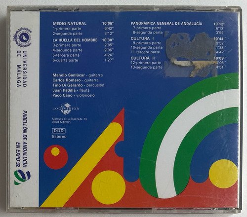 Enciclopedia Electrónica de Andalucía / Banda sonora original / Manolo Sanlúcar, guitarra – Carlos Romero, guitarra – Tino Di Gerardo, percusión – Juan Padilla, flauta – Paco Cano, violoncelo / Universidad de Málaga / Pabellón de Andalucía En Expo’92 / logivision / Edição importada União Europeia – 1992 / CD tocando normalmente. A Oto Livraria é uma extensão da Oto Reifschneider Galeria de Arte, que funciona em Brasília desde 2015. Com foco em artes e assuntos correlatos (como design, ilustração, fotografia e histórias em quadrinhos), o acervo também conta com LPs, CDs e DVDs. A Oto Livraria funciona na mesma quadra da galeria de arte. As compras podem ser retiradas pessoalmente em Brasília ou enviadas pelos Correios (solicite valores de envio).