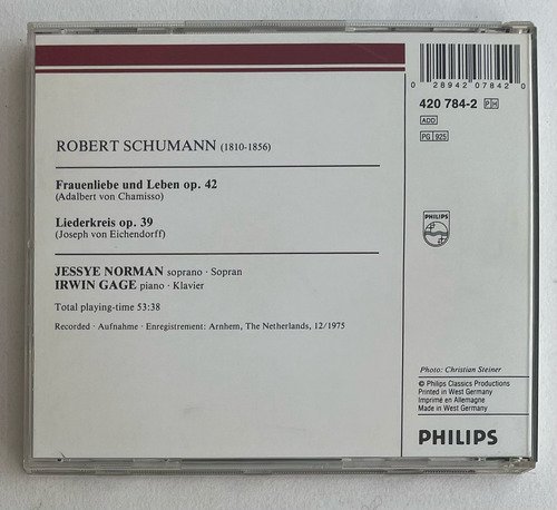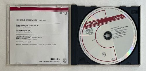 Jessye Norman, soprano / Irwin Gage, piano / Robert Schumann (1810-1856) / Frauenliebe unb Leben op. 42 – Liederkreis op. 39 / Philips / Edição importada Alemanha – 1976 / CD tocando normalmente. A Oto Livraria é uma extensão da Oto Reifschneider Galeria de Arte, que funciona em Brasília desde 2015. Com foco em artes e assuntos correlatos (como design, ilustração, fotografia e histórias em quadrinhos), o acervo também conta com LPs, CDs e DVDs. A Oto Livraria funciona na mesma quadra da galeria de arte. As compras podem ser retiradas pessoalmente em Brasília ou enviadas pelos Correios (solicite valores de envio).