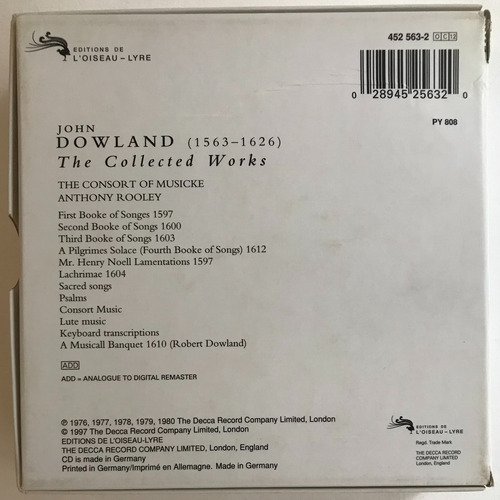John Dowland – The Collected Works (Ouvres) – The Consort of Musicke – Anthony Rooley. Caixa com 12 CDs. Com encarte. Selo: Decca / L’Oiseau-Lyre. Fabricado na Inglaterra.
